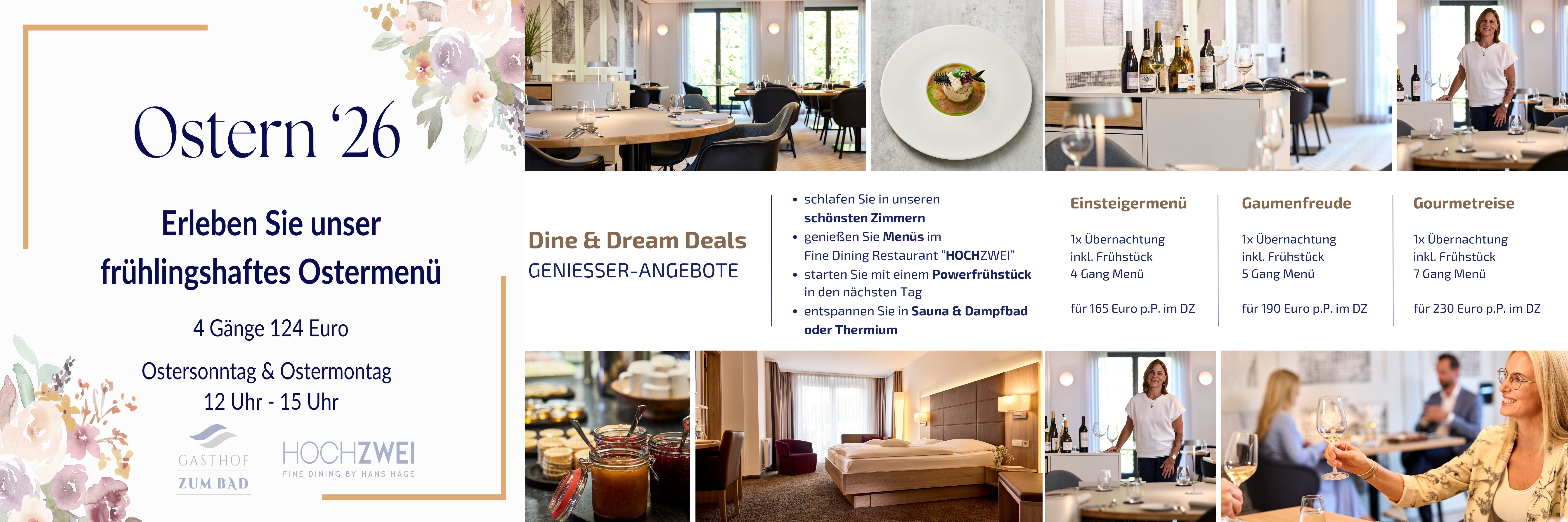 Sie finden bei uns drei besondere Dine & Dream Deal - Angebote: Übernachten Sie in unseren schönsten Zimmern und lassen Sie sich von Hans Häge und seinem Küchenteam verwöhnen. Nach einem genussvollen Abend schlafen Sie entspannt aus und starten mit einem reichhaltigen Frühstück in unserem Hotel GASTHOF ZUM BAD in den Tag.