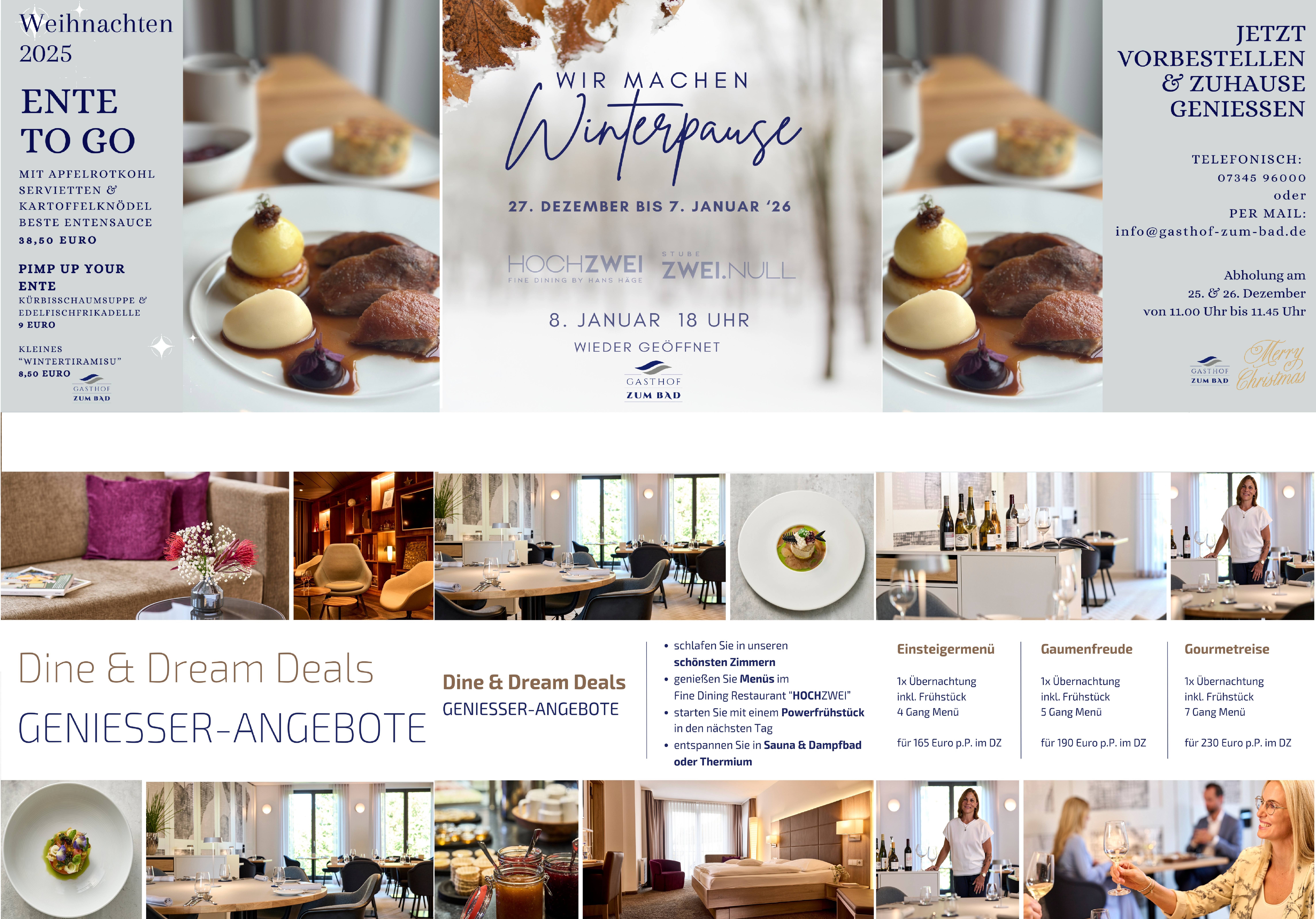 Für Zimmerbuchungen, Tischreservierungen und Gutscheine können Sie uns telefonisch kontaktieren oder eine E-Mail an info@gasthof-zum-bad.de schicken.